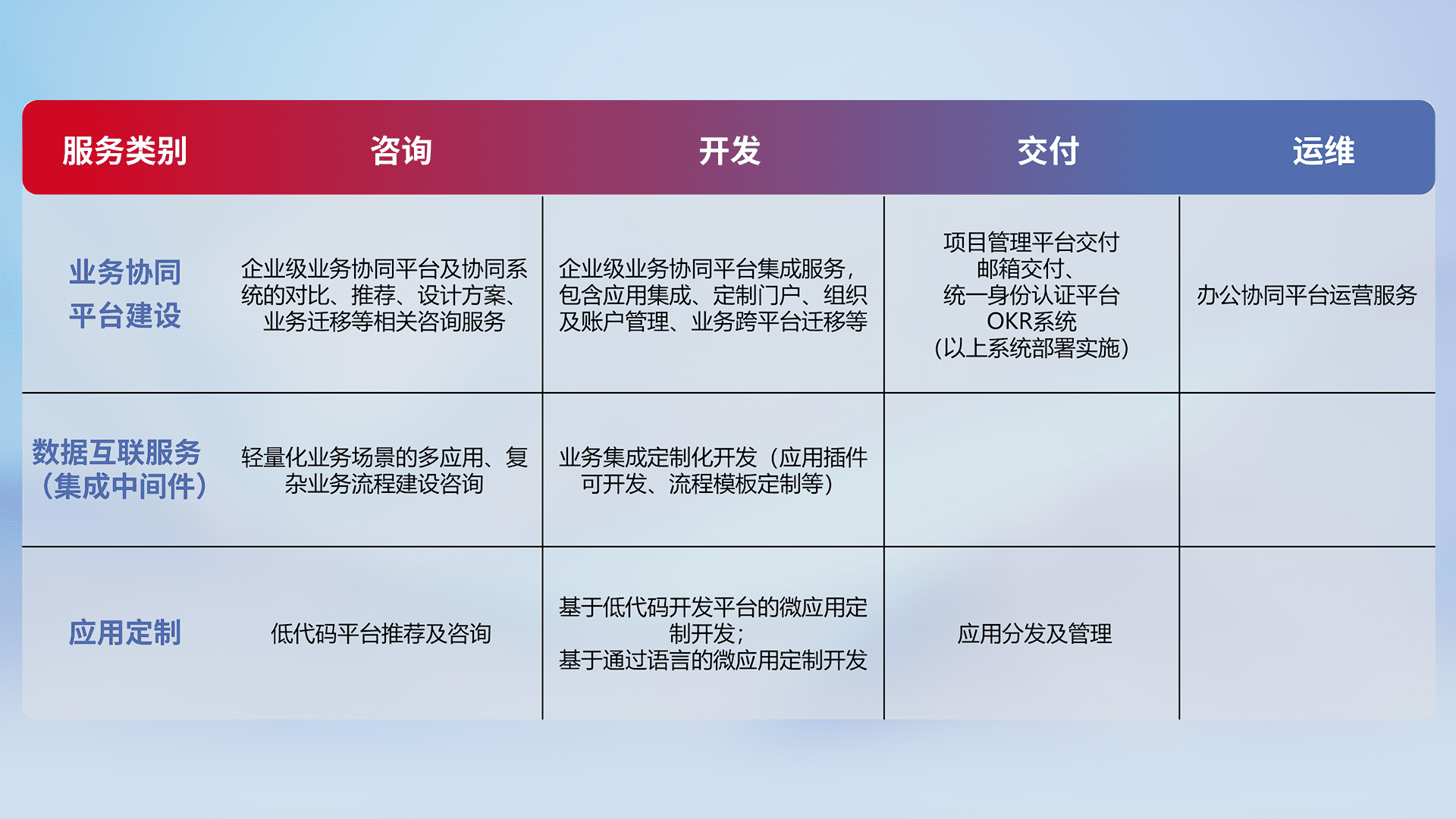 针对钉钉、、、、企微、、、、IDaas等平台级产品提供产品的规划、、方案、、、交付、、定制化开发等服务,,实现如统一协同办公、、智能客户服务、、混合会议管理、、智能数据查询、、、、等业务场景,,,实现数字化转型。。。